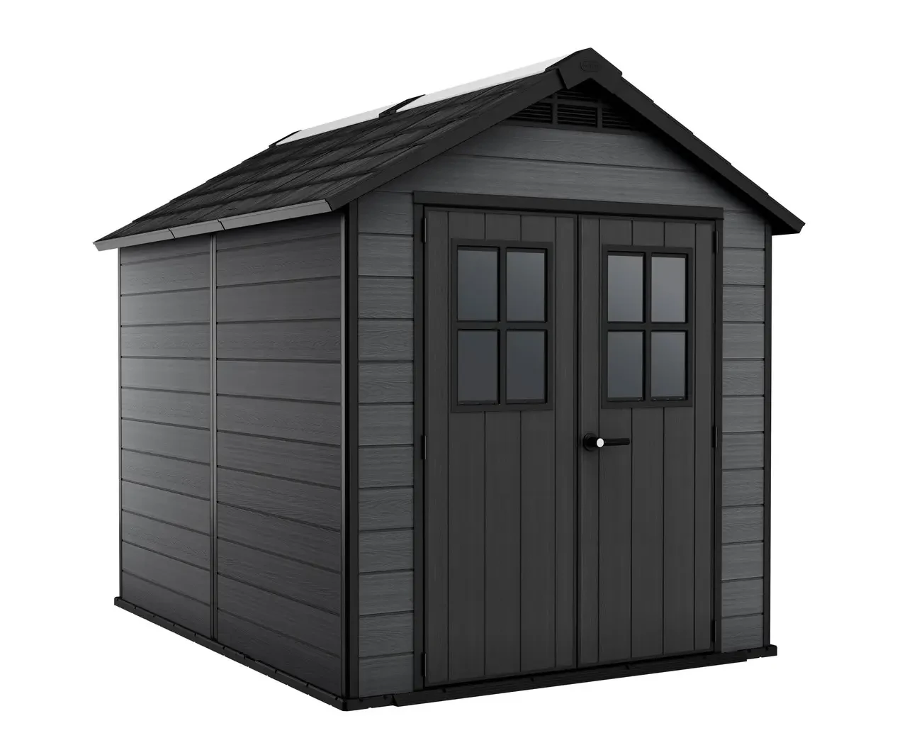 Сарай пластиковий Keter Newton 759 у стильному відтінку* антрацит виготовлений з інноваційного композитного матеріалу EvotechTM, який за текстурою та виглядом імітує дерево, утворюючи міцну та стійку до погодних впливів довговічну контрукцію садового будиночка преміумкласу.